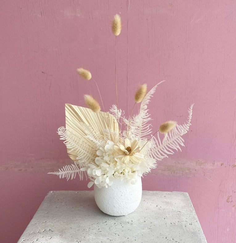 A vessel full of everlasting & preserved blooms. If you have any specific colour requests please let us know via email.