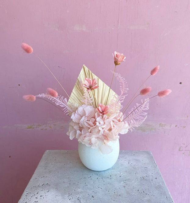 A vessel full of everlasting & preserved blooms. If you have any specific colour requests please let us know via email.